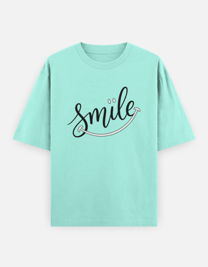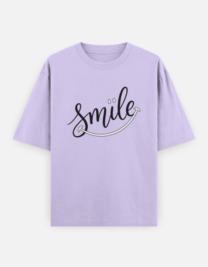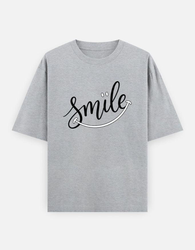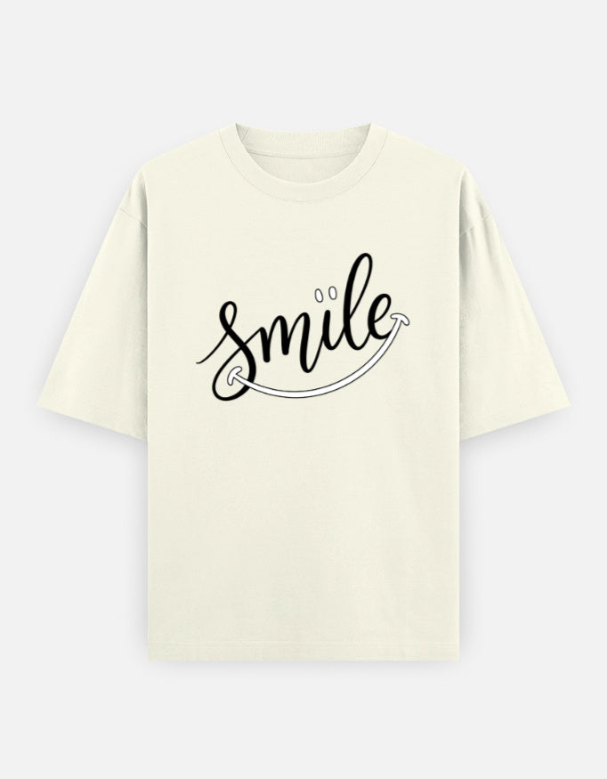 The “Just Smile” Oversized T-Shirt features a clean handwritten-style graphic with a subtle curved underline forming a smile — minimal yet expressive. It’s made for those who believe positivity is a style statement.
