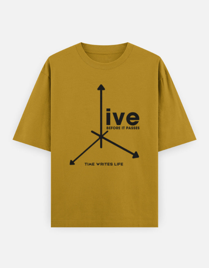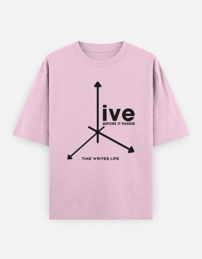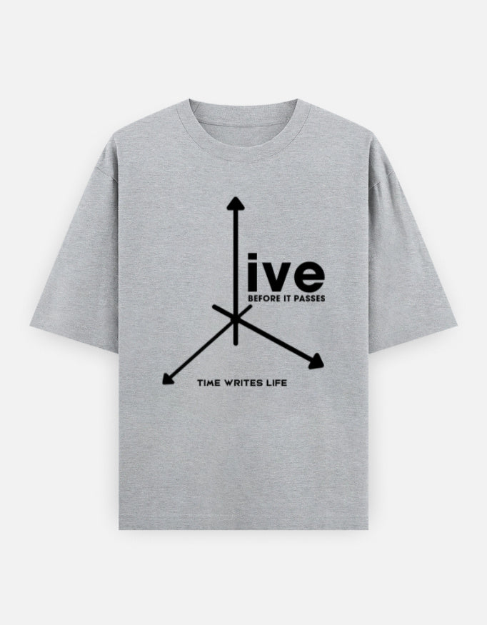 The “Time Writes Life” Oversized T-Shirt blends minimalist graphic design with deep meaning. Featuring a striking arrow-axis design and the statement “Live Before It Passes”, this tee represents direction, motion, and purpose.